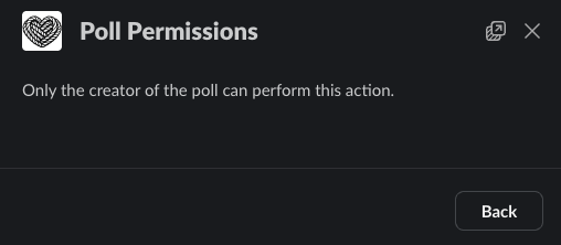 - Not shown to participants - The poll results are never shown publicly to participants. Only the poll creator may privately view the poll results. Voters are notified of a successful vote via a private ephemeral message.